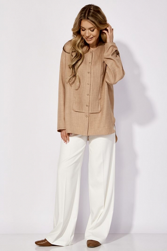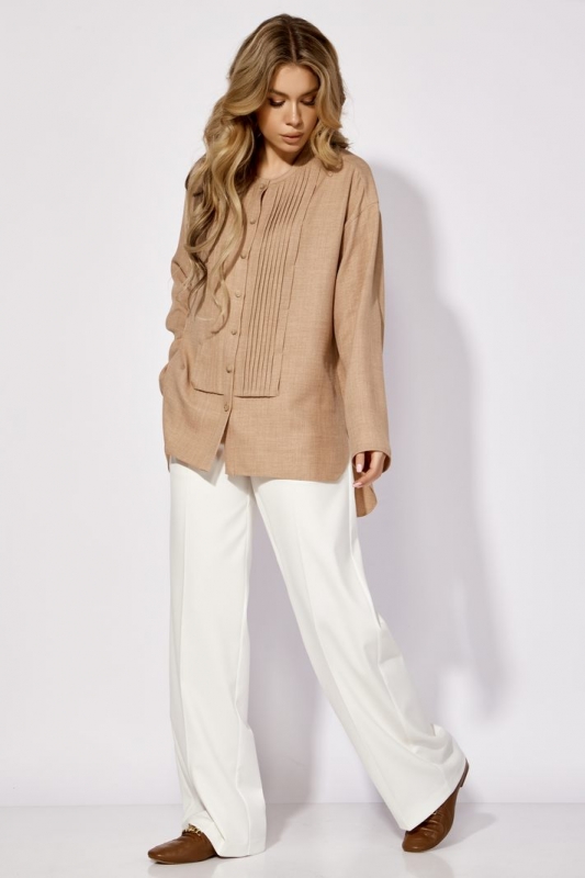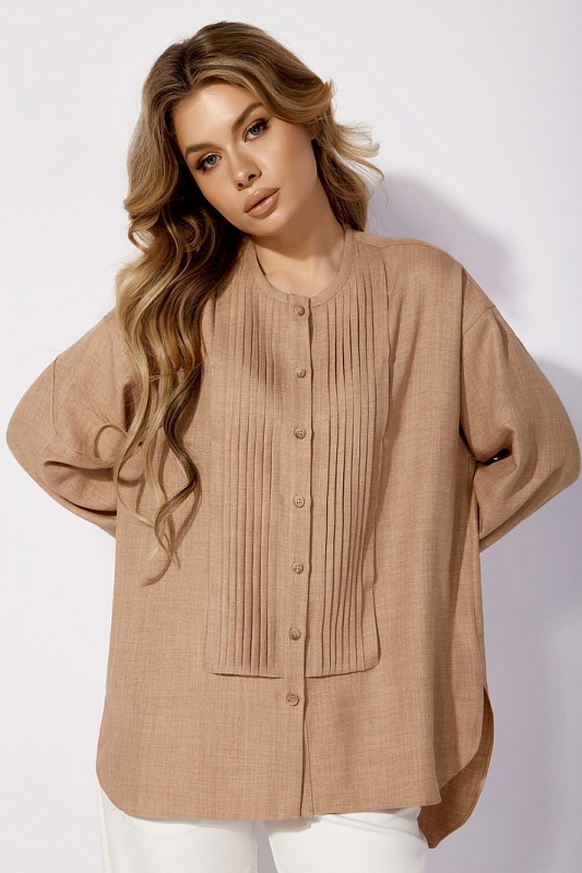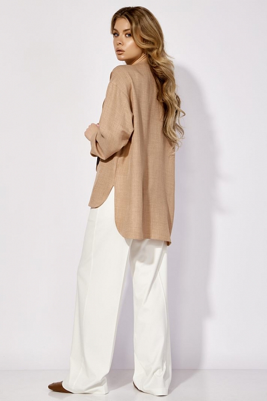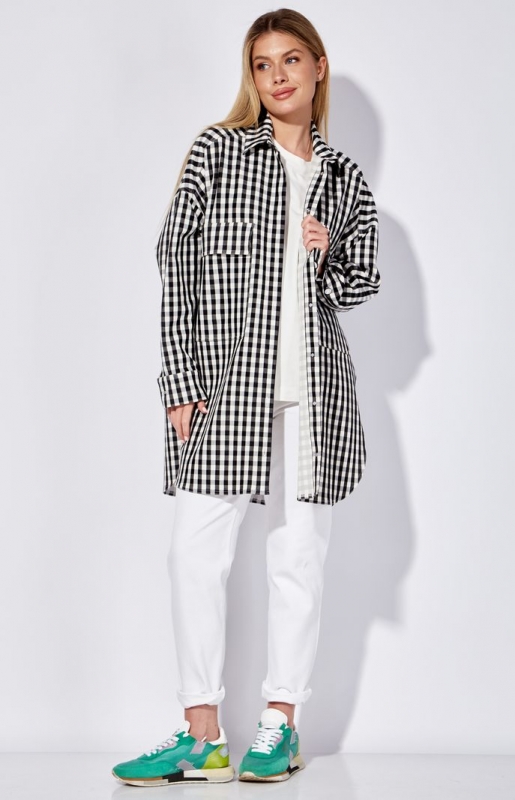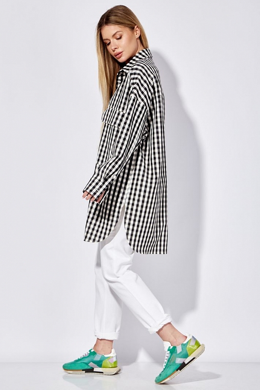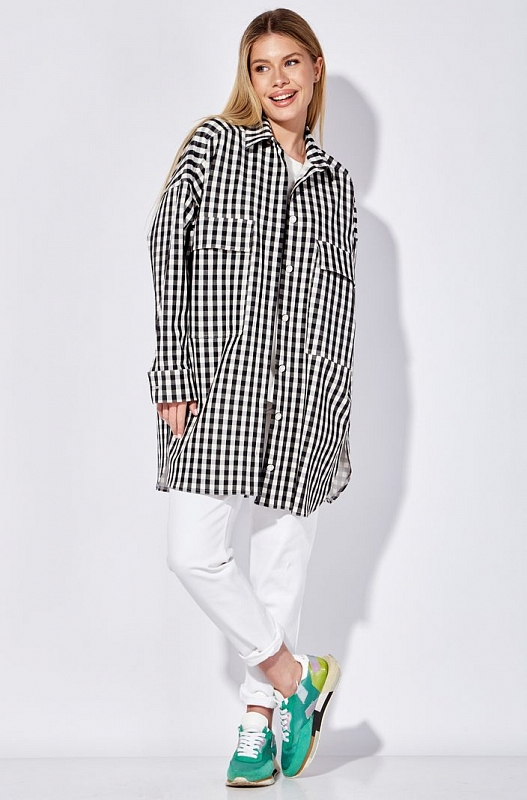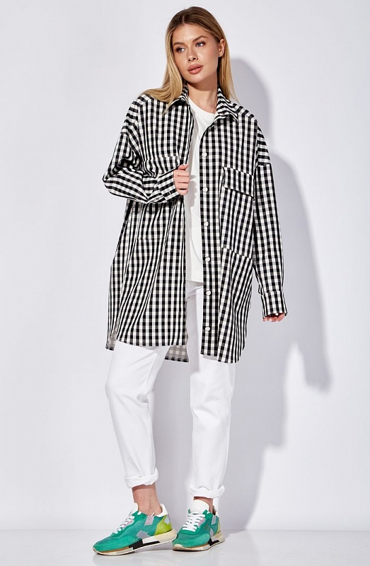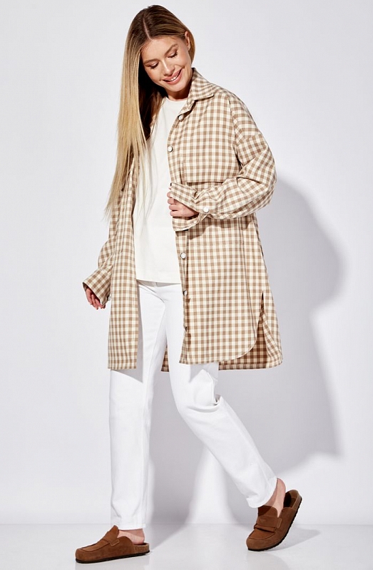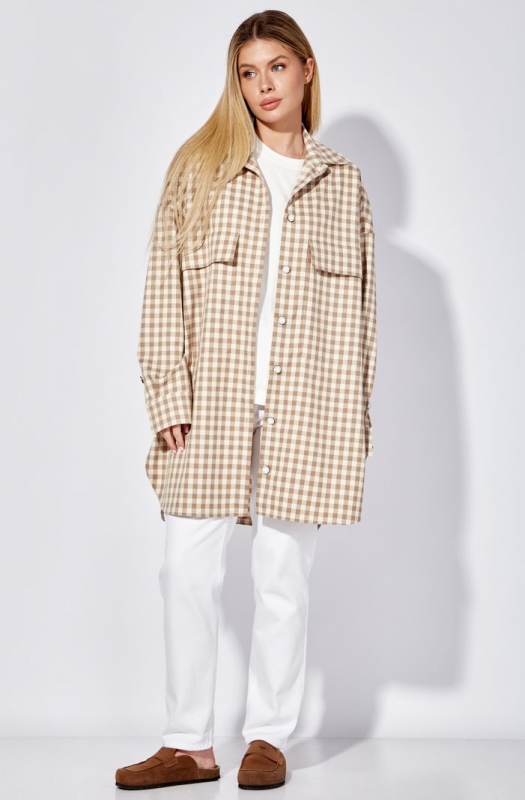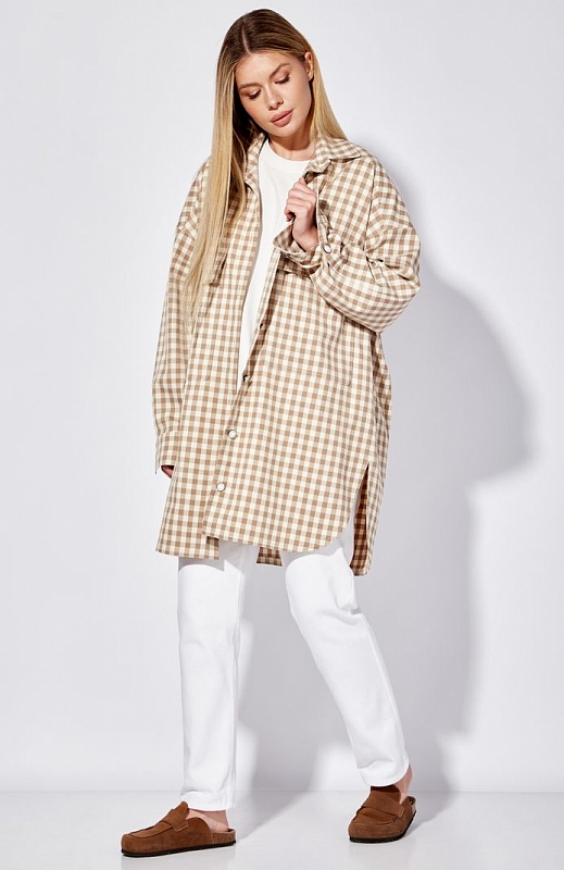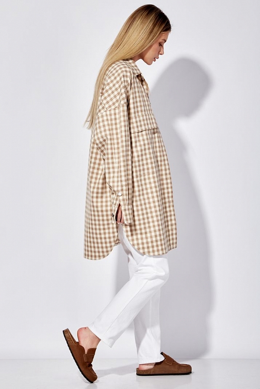 Женская удлиненная рубашка oversize прямого силуэта из мягкой плательной ткани в бежевую клетку. Застегивается рубашка на петли и пробивные пуговицы (болт). Горловина обработана втачным воротником на стойке, рукава втачные с притачными манжетами по низу, застегивающиеся на петли и пуговицы (болт). Спереди обработаны 2 больших накладных кармана с клапанами. По спинке отрезная горизонтальная кокетка. Линия низа фигурная.