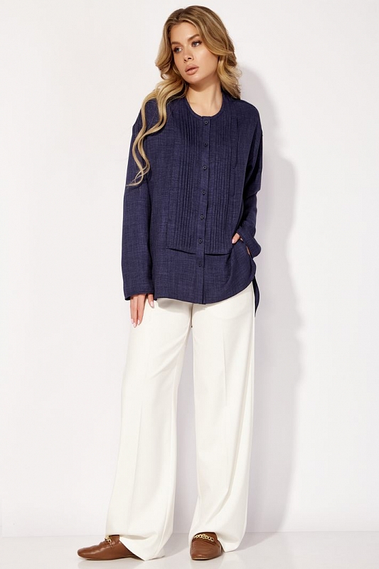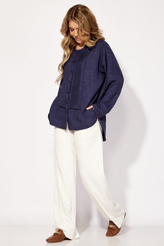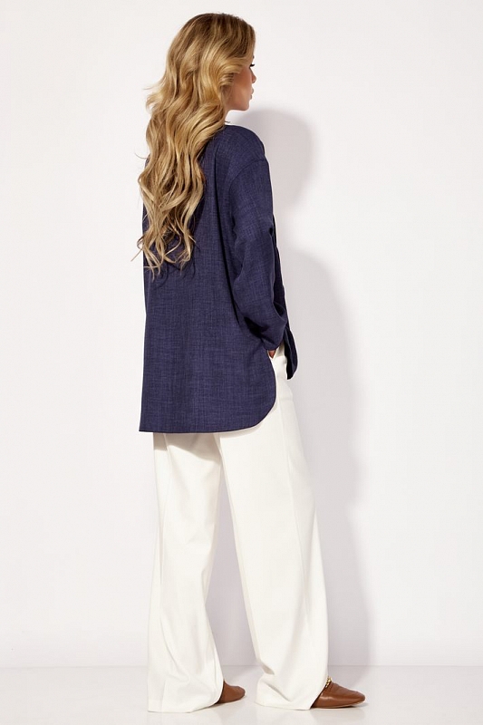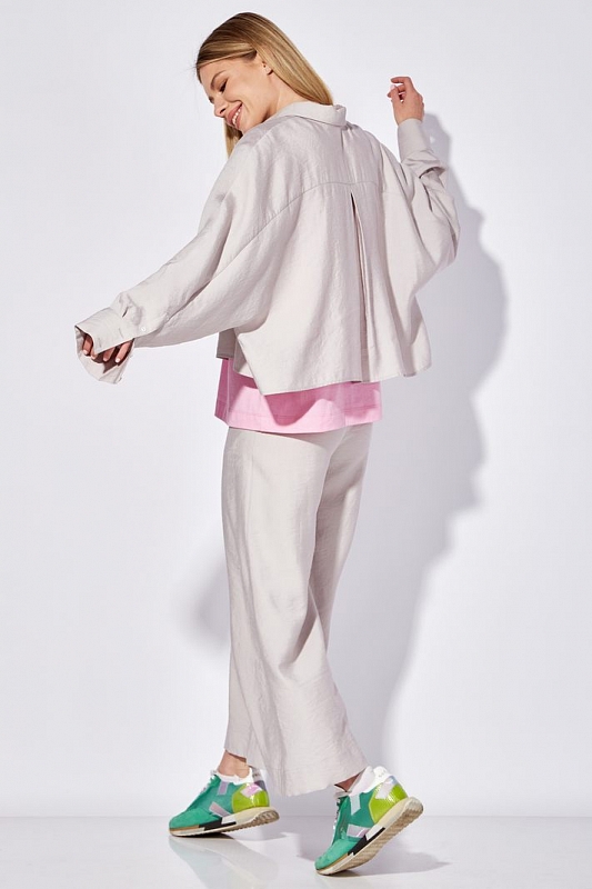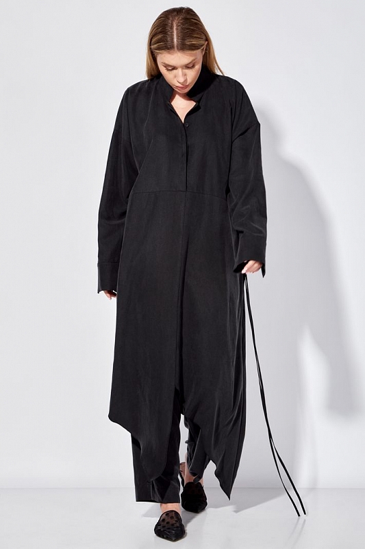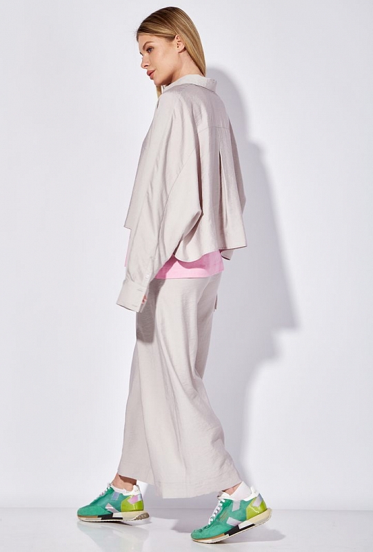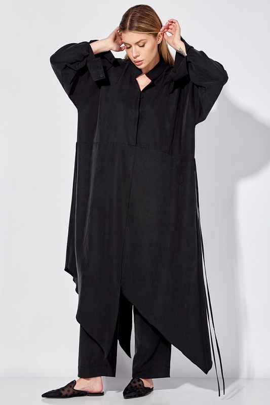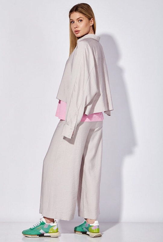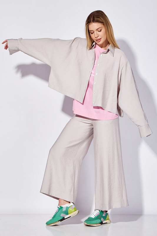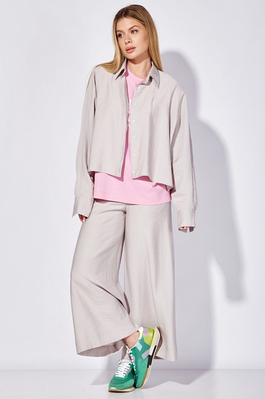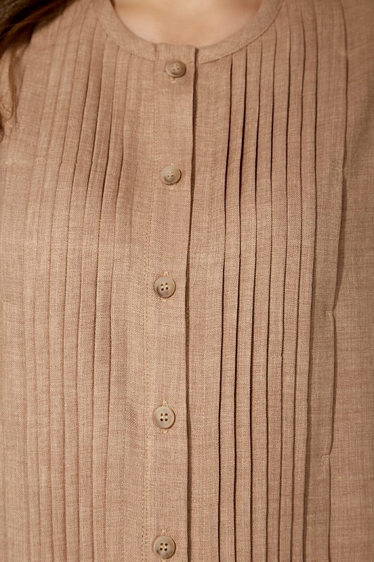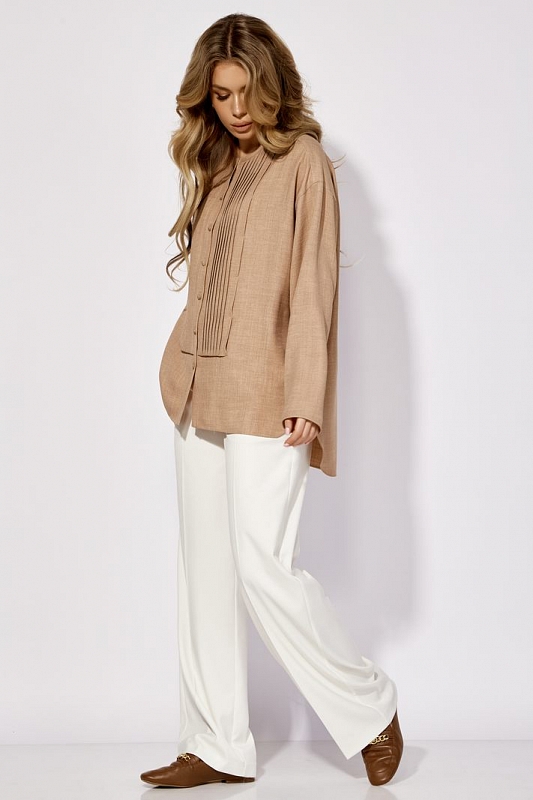 Женская удлиненная рубашка oversize прямого силуэта из мягкой плательной ткани в бежевую клетку. Застегивается рубашка на петли и пробивные пуговицы (болт). Горловина обработана втачным воротником на стойке, рукава втачные с притачными манжетами по низу, застегивающиеся на петли и пуговицы (болт). Спереди обработаны 2 больших накладных кармана с клапанами. По спинке отрезная горизонтальная кокетка. Линия низа фигурная.