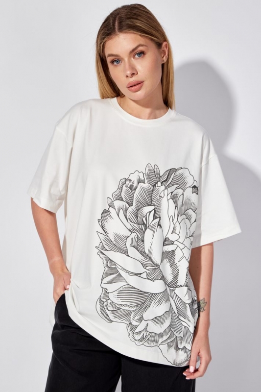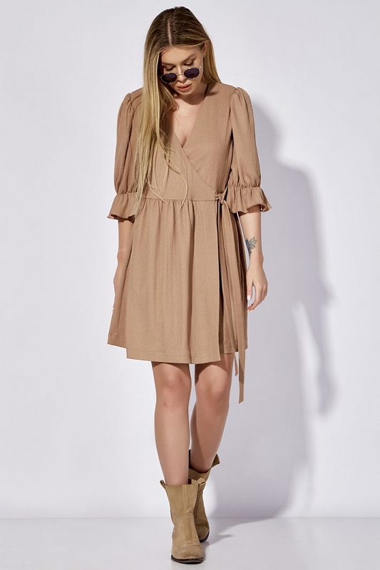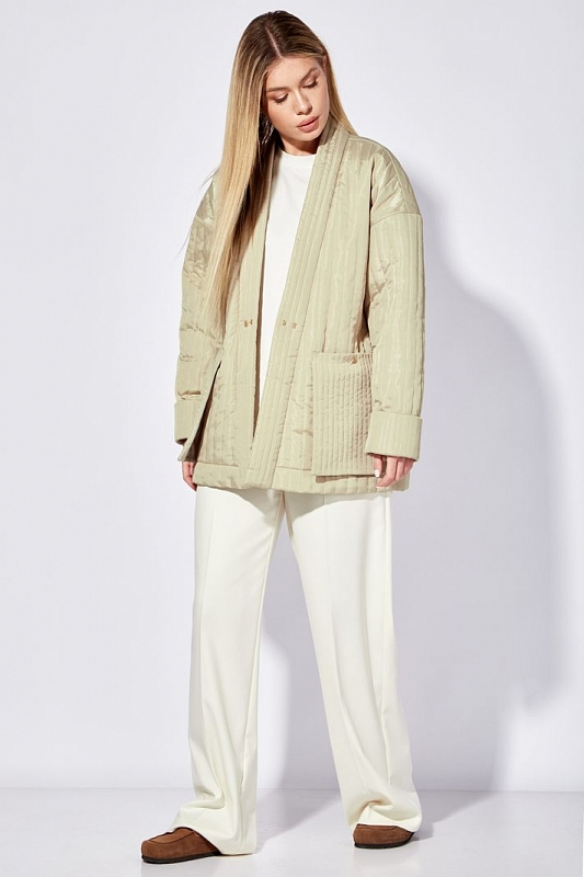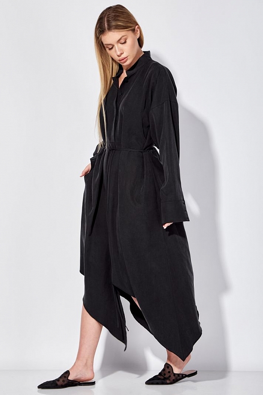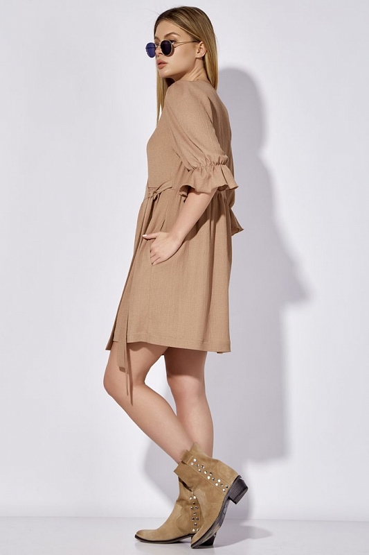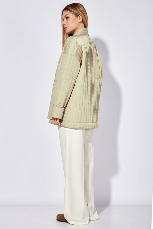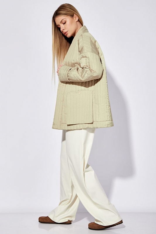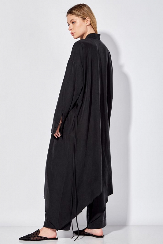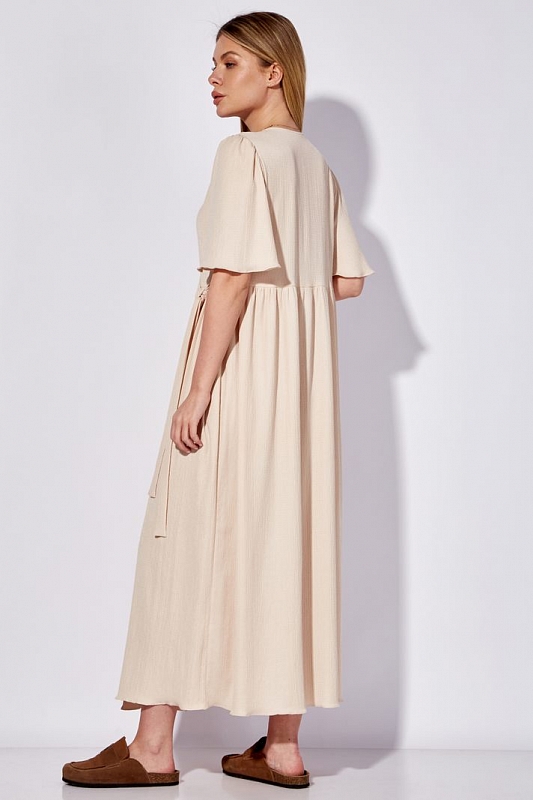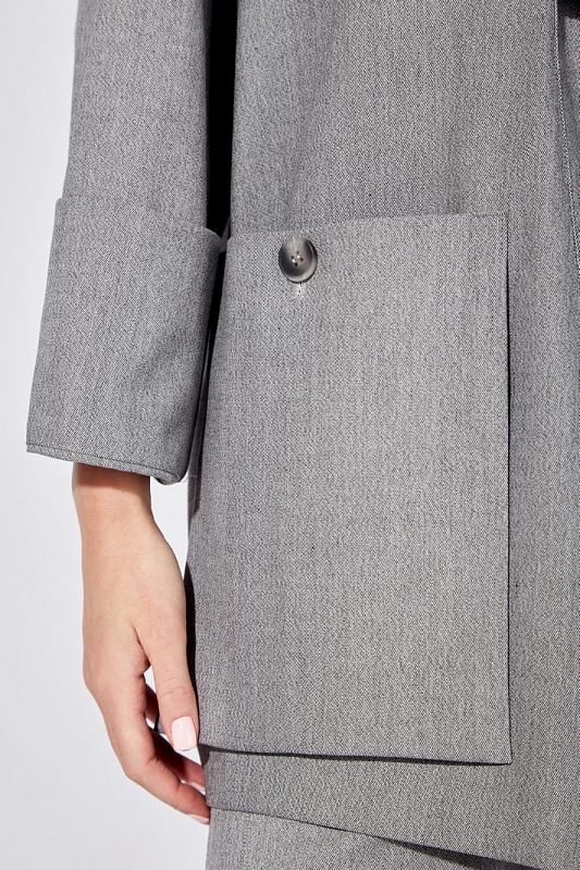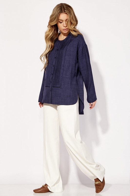 Женская удлиненная рубашка oversize прямого силуэта из мягкой плательной ткани в бежевую клетку. Застегивается рубашка на петли и пробивные пуговицы (болт). Горловина обработана втачным воротником на стойке, рукава втачные с притачными манжетами по низу, застегивающиеся на петли и пуговицы (болт). Спереди обработаны 2 больших накладных кармана с клапанами. По спинке отрезная горизонтальная кокетка. Линия низа фигурная.