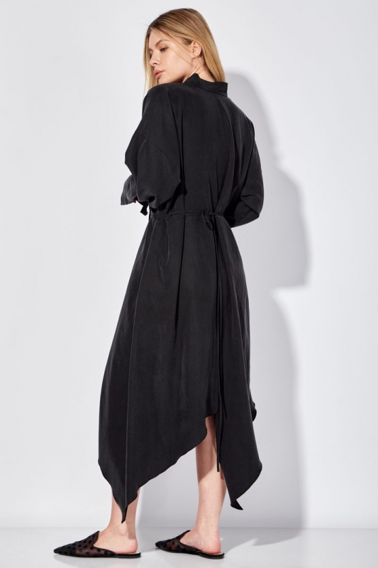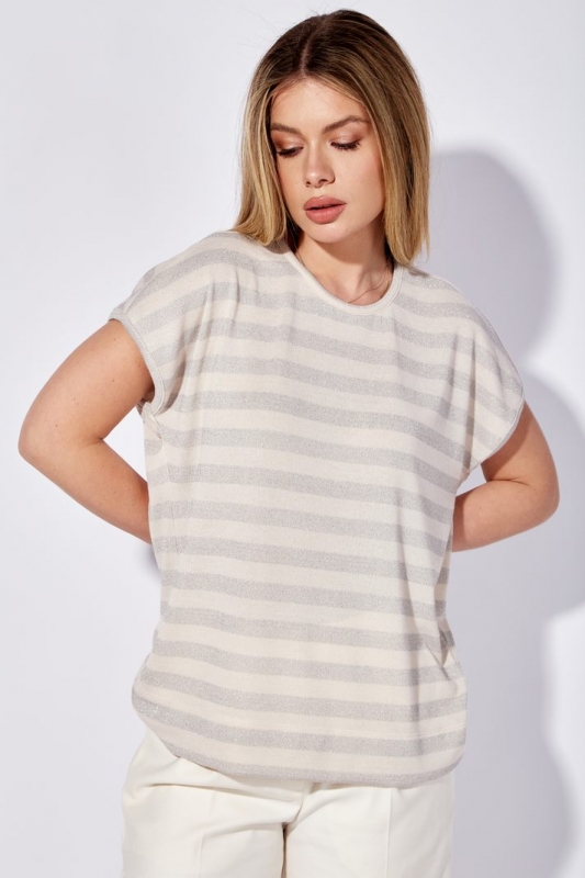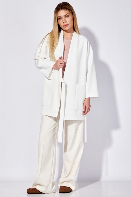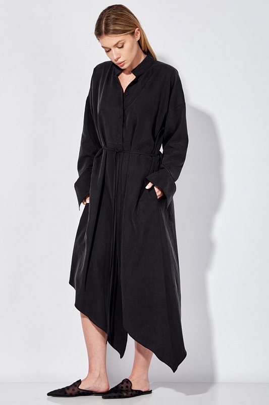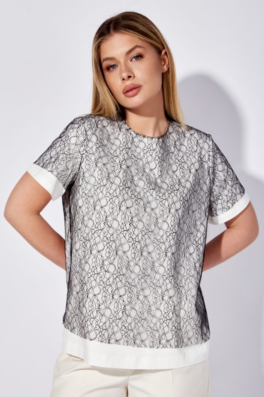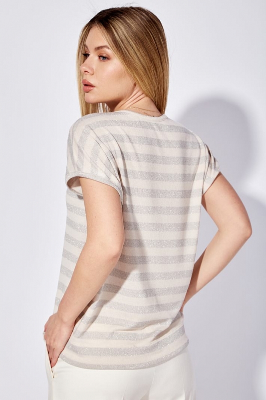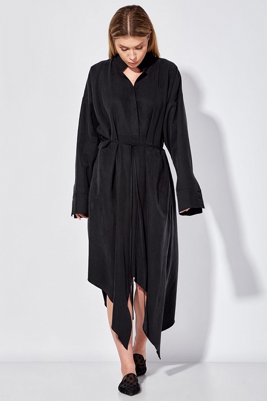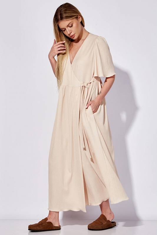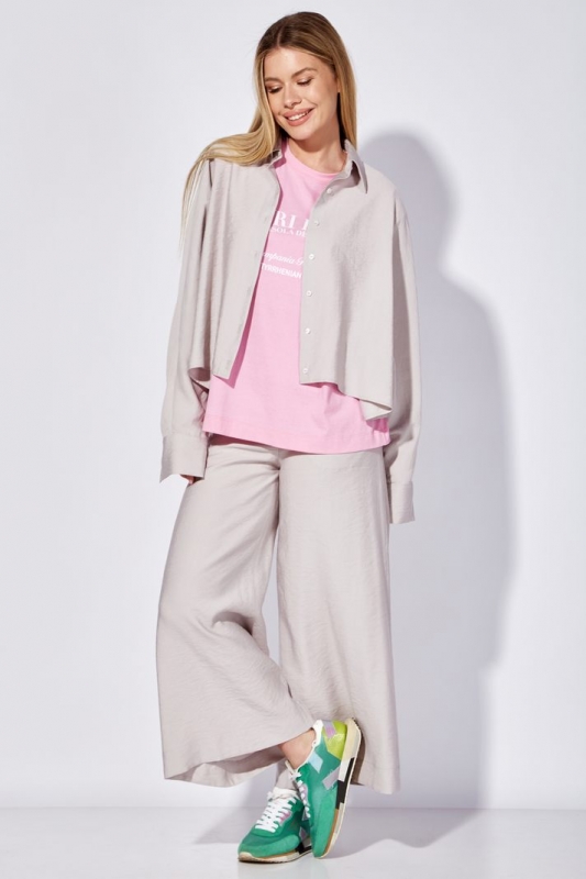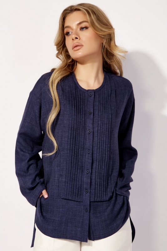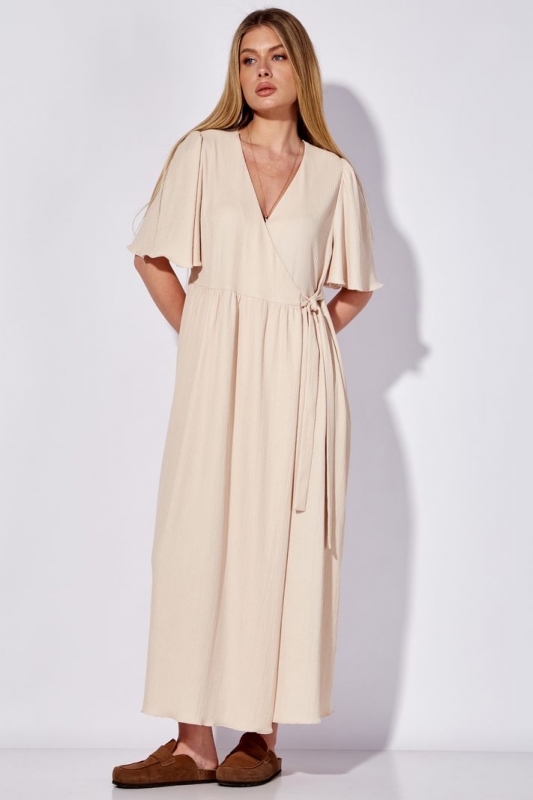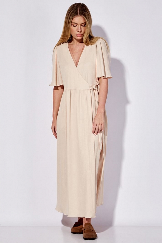 Женская удлиненная рубашка oversize прямого силуэта из мягкой плательной ткани в бежевую клетку. Застегивается рубашка на петли и пробивные пуговицы (болт). Горловина обработана втачным воротником на стойке, рукава втачные с притачными манжетами по низу, застегивающиеся на петли и пуговицы (болт). Спереди обработаны 2 больших накладных кармана с клапанами. По спинке отрезная горизонтальная кокетка. Линия низа фигурная.